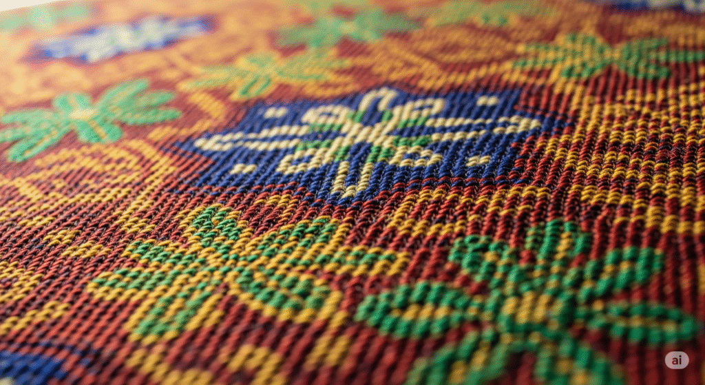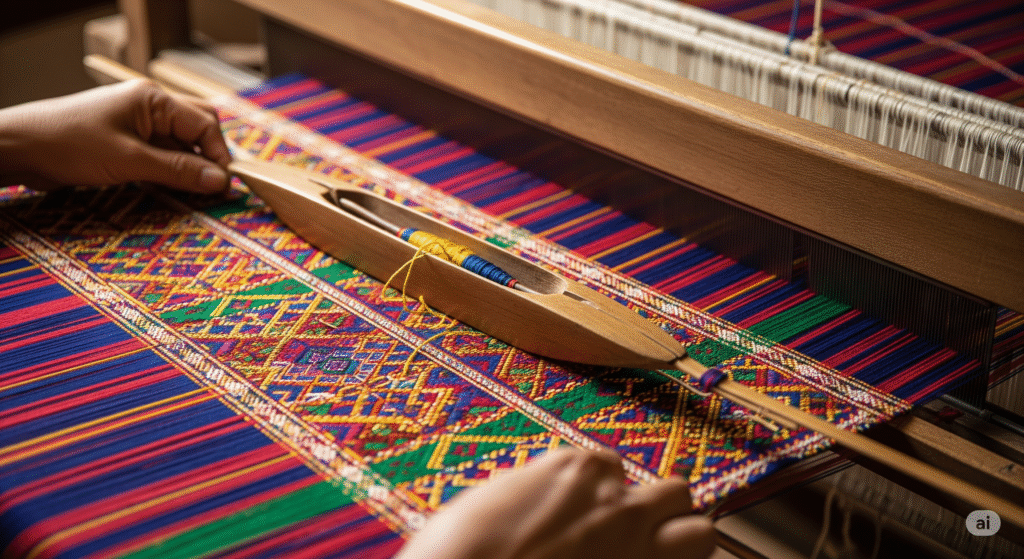 Weaving on a traditional loom – The artisan weaves each thread by hand, ensuring precision and pattern accuracy.